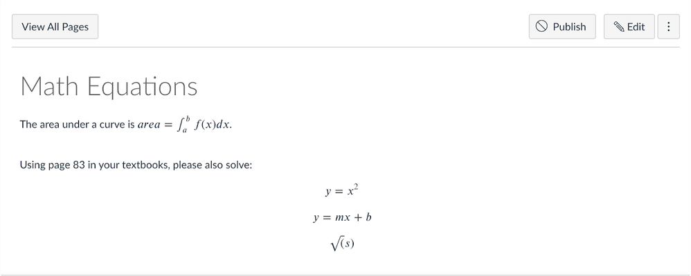 If you teach in quantitative subjects that use mathematical or chemical expressions, equations, and formulae, there are some features in Canvas you should know about to help you make mathematical expressions that display properly while also being accessible to a variety users. It also might be worth your time to learn more about LaTeX, a markup language specifically for displaying math symbols and expressions. This article will cover simple to more advanced options, and share some links to help you work more efficiently with math symbols in your Canvas course.
