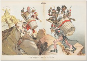 Figure 4-21: This cartoon depicts a representation of Rudyard Kipling’s famous poem The White Man’s Burden. Originally published in February, 1899 the poem’s philosophy quickly developed as the United States response to annexation of the Philippines. The United States used the “white man’s burden” as an argument for imperial control of the Philippines and Cuba on the basis of moral necessity. It was now the United States’ moral duty to develop and modernize the conquest lands in order to help carry the foreign barbarians to civilization. Source: https://commons.wikimedia.org/wiki/File:%22The_White_Man%27s_Burden%22_Judge_1899.png#/media/File:%22The_White_Man%27s_Burden%22_Judge_1899.png Permission: Public Domain. Courtesy of Victor Gilliam.